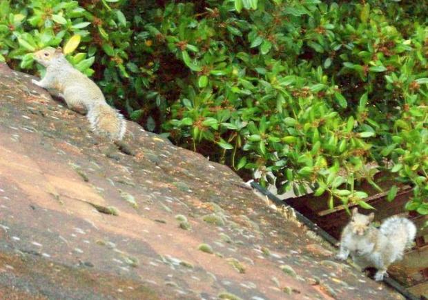 Tá, vocês devem estar se perguntando “como que essa mini-criatura sabe qual é um, qual é o outro????”. Simples. O Dale é gordo e maior (o que me leva a crer que o Chip é A Chip), ele tem a beira do rabo mais branca e a cara vermelha. O Chip não. O Chip é hiperativo, parece que tomou efedrina, é mais cinza e não tem a cara tão vermelha quanto o Dale. E eles tem rotas diferentes para o nosso telhado. O Chip vem por essa árvore aí, perto do quarto… O Dale sobe a calha do outro lado do telhado (à direita), perto da cozinha. Simples.